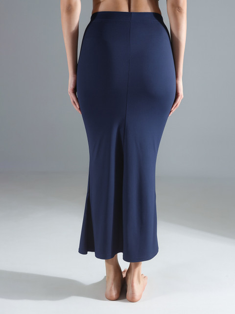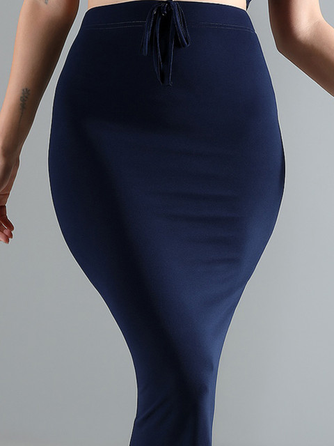 Navy blue solid saree shapewear, has an elasticated waistband with inner drawstring closure, seamless and a side slit