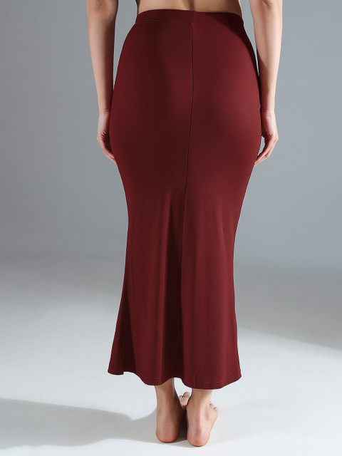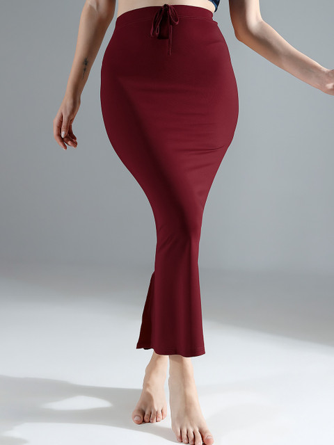 Maroon solid saree shapewear, has an elasticated waistband with inner drawstring closure, seamless and a side slit