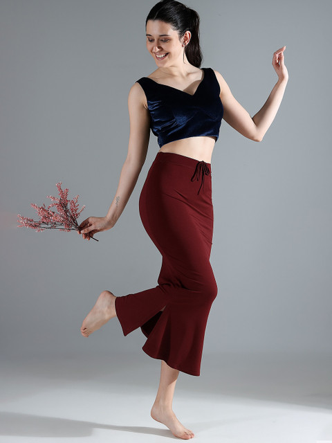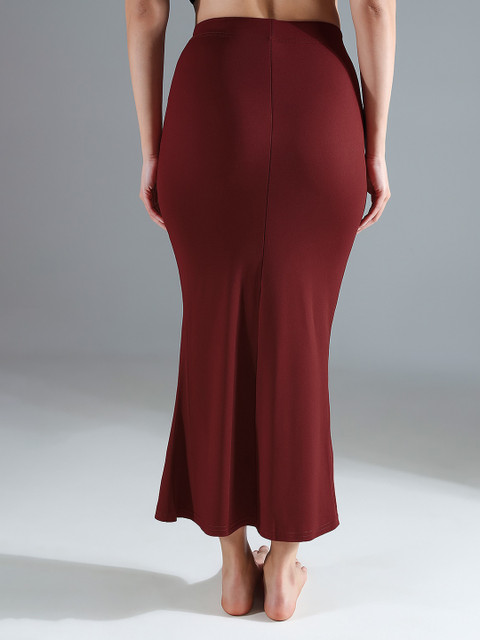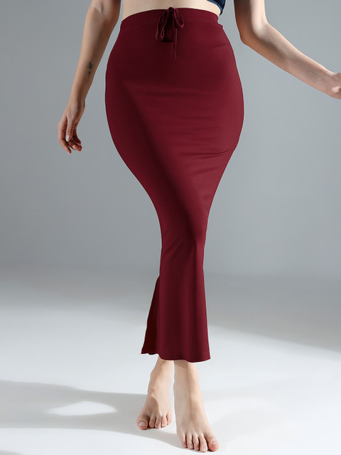 Maroon solid saree shapewear, has an elasticated waistband with inner drawstring closure, seamless and a side slit