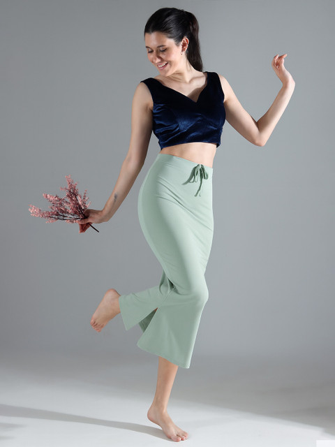 Green solid saree shapewear, has an elasticated waistband with inner drawstring closure, seamless and a side slit