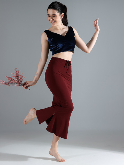Maroon solid saree shapewear, has an elasticated waistband with inner drawstring closure, seamless and a side slit