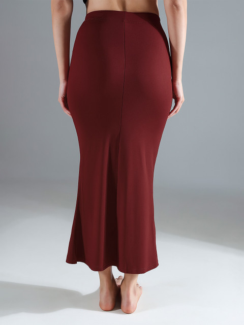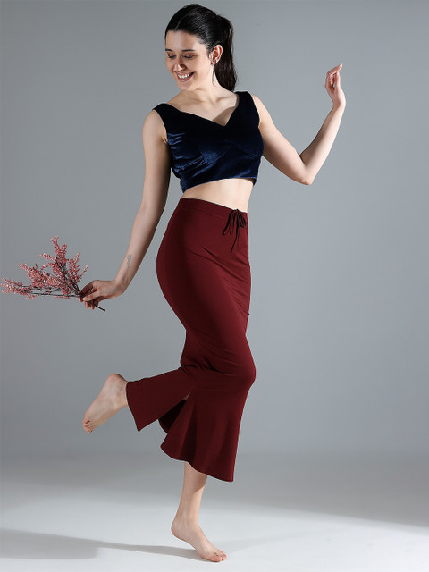 Maroon solid saree shapewear, has an elasticated waistband with inner drawstring closure, seamless and a side slit