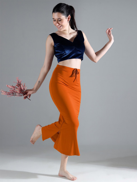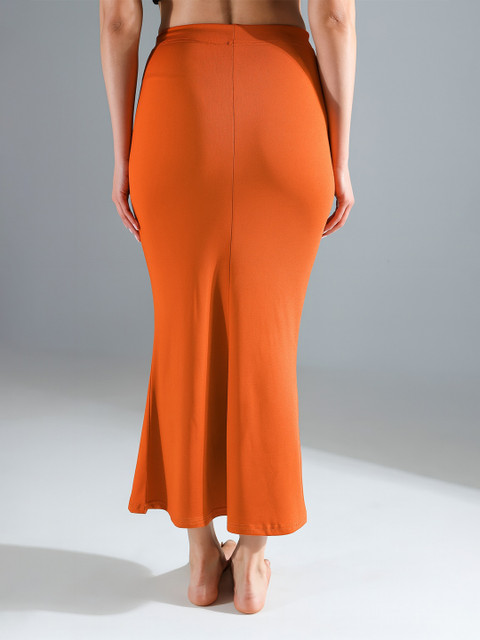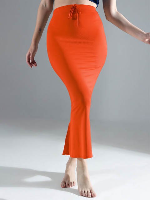 Orange colored solid saree shapewear, has an elasticated waistband with inner drawstring closure, seamless and a side slit