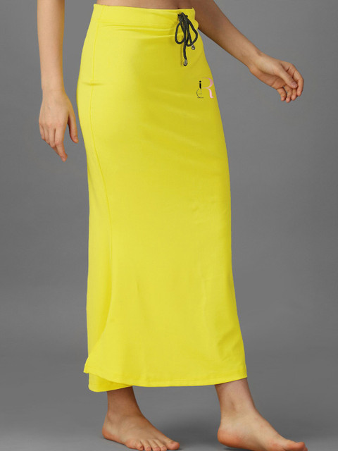 Pack of 2 solid saree shapewear in yellow and maroon, each has an elasticated waistband, seamless, side slit and drawstring closure