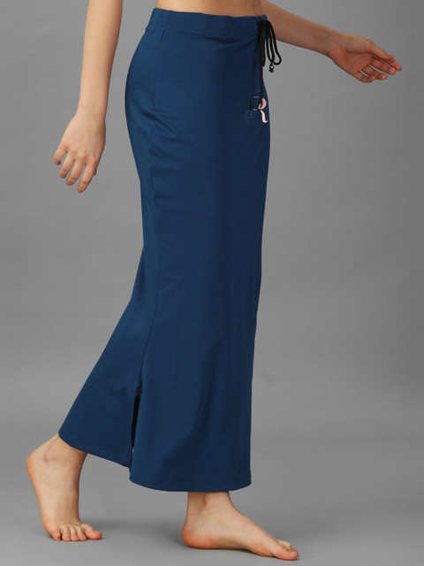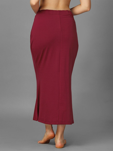 Pack of 2 solid saree shapewear in navy blue and maroon, each has an elasticated waistband, seamless, side slit and drawstring closure
