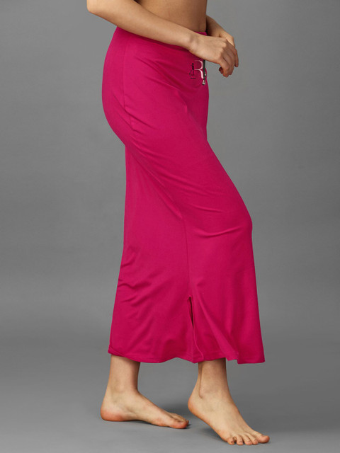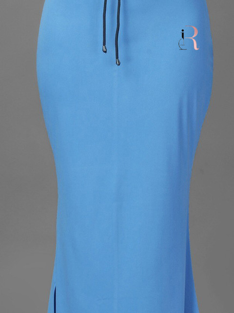 Pack of 2 solid fish cut saree shapewear in blue and pink, each has an elasticated waistband, seamless, flared hem, side slit and drawstring closure