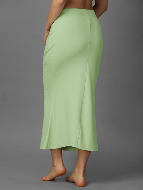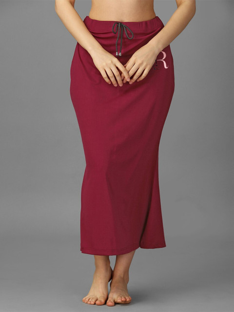 Pack of 2 solid saree shapewear in green and maroon, each has an elasticated waistband, seamless, side slit and drawstring closure