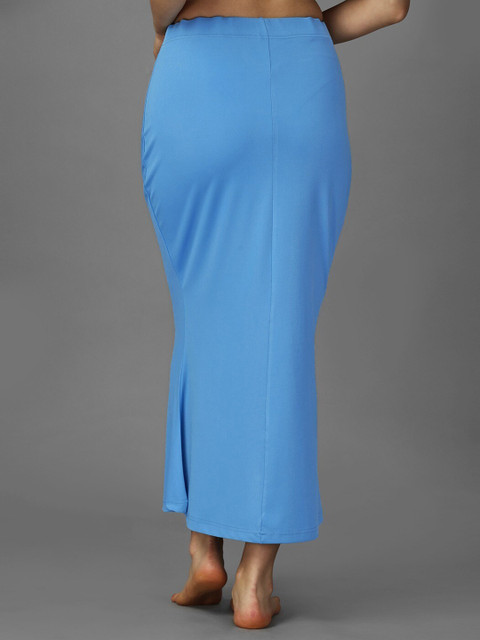 Pack of 2 solid saree shapewear in blue and maroon, each has an elasticated waistband, seamless, side slit and drawstring closure