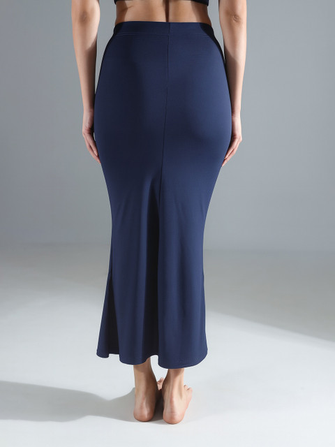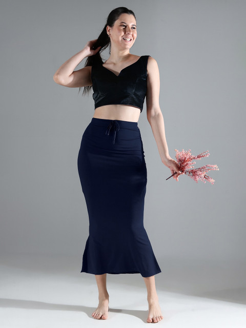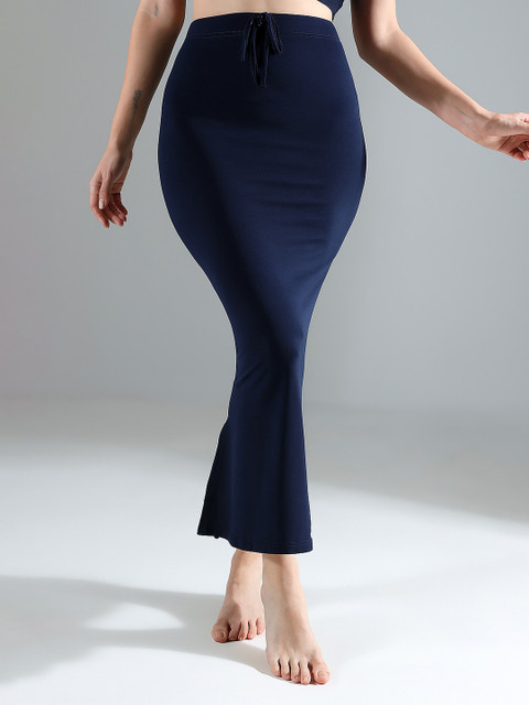 Navy blue solid saree shapewear, has an elasticated waistband with inner drawstring closure, seamless and a side slit