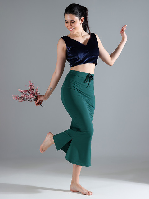 Green solid saree shapewear, has an elasticated waistband with inner drawstring closure, seamless and a side slit