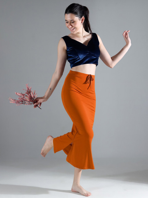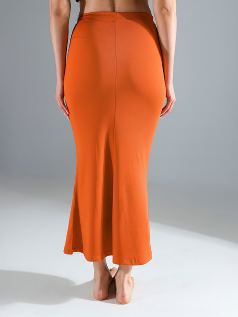 Orange solid saree shapewear, has an elasticated waistband with inner drawstring closure, seamless and a side slit