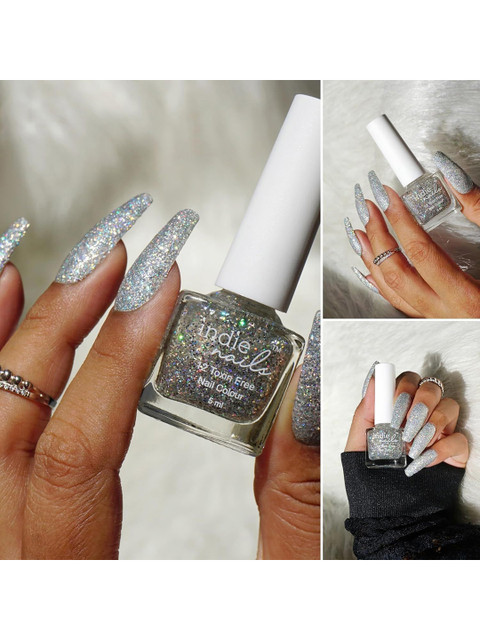 Disco Nights silver glitter nail polish with holographic mylarslong-lasting, high-shine, chip-resistant, quick-dry, vegan, 12-free nail paint for women.