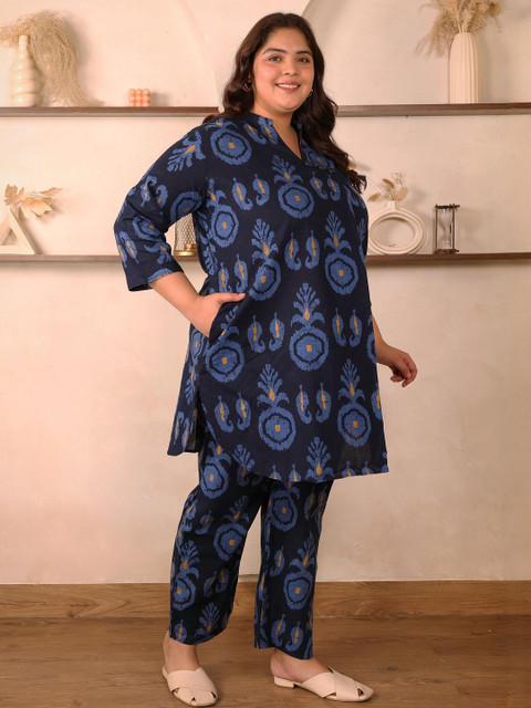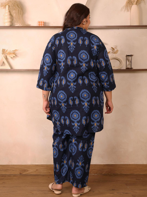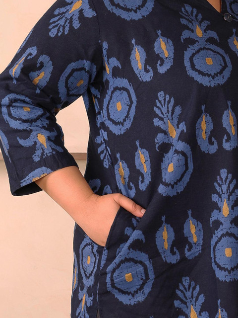 Navy Blue printed tunic , has a mandarin collar neck and three quarter sleeves, secured with slip-on closure