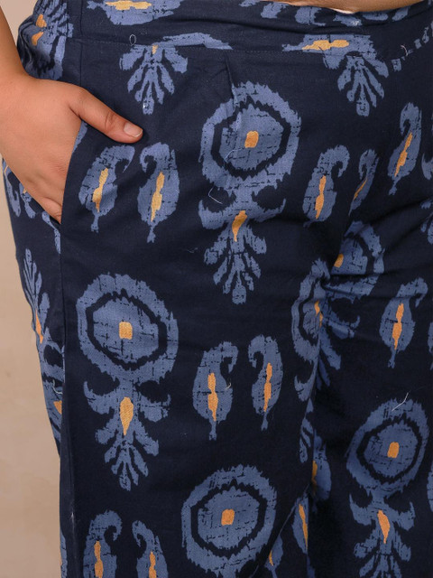 Navy Blue printed trousers, has an elasticated waistband with slip-on closure has 2 pockets