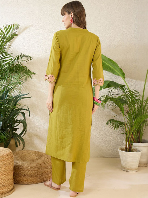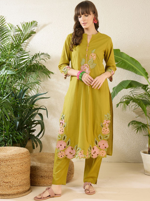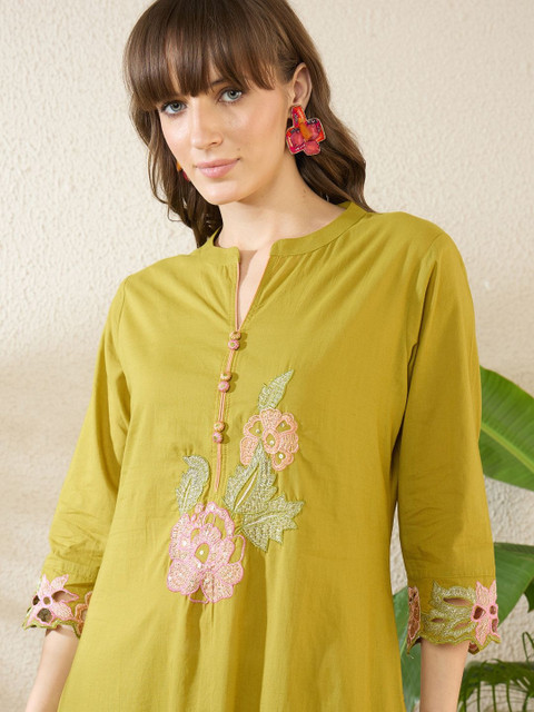 Yellow & pink embroidered top, has a round- neck and three-quarter sleeves, secured slip-on closure