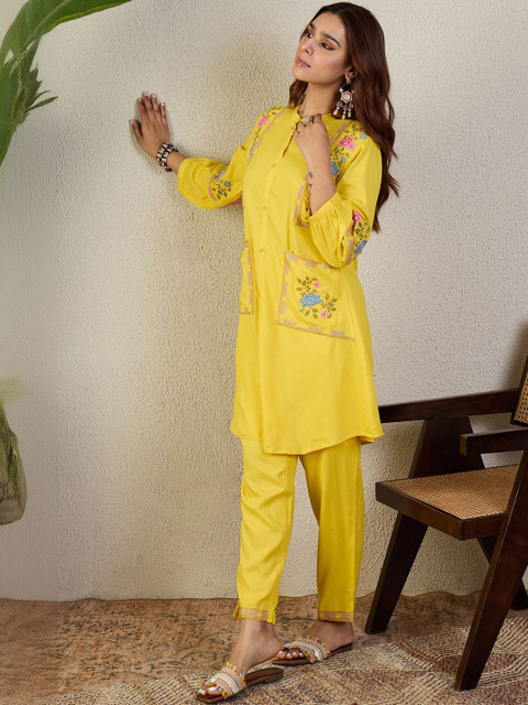 Yellow Embroidered tunic , has a mandarin-collar neck and Three-Quarter Sleeves secured with slip on closure