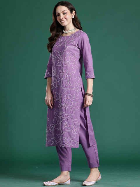 Purple Embroidery top , has a round neck and three quarter sleeves, secured with slip-on closure