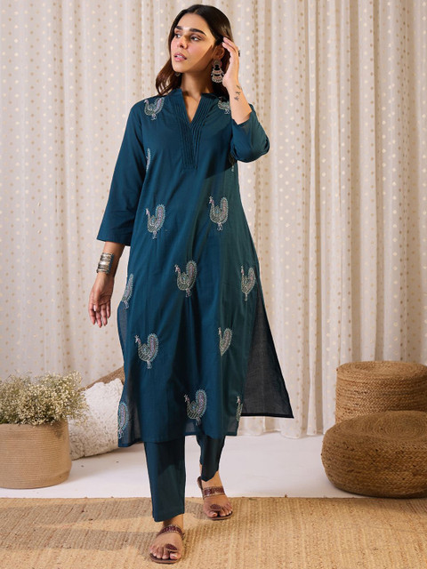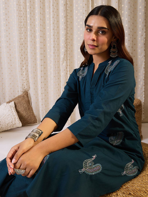 Teal blue, white and pink embroidered tunic, has a mandarin collar neck and three-quarter sleeves