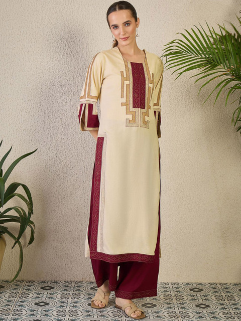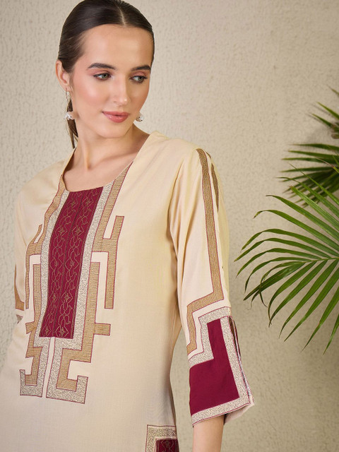 Beige & maroon embroidered kurta, has a round neck with three-quarter sleeves
