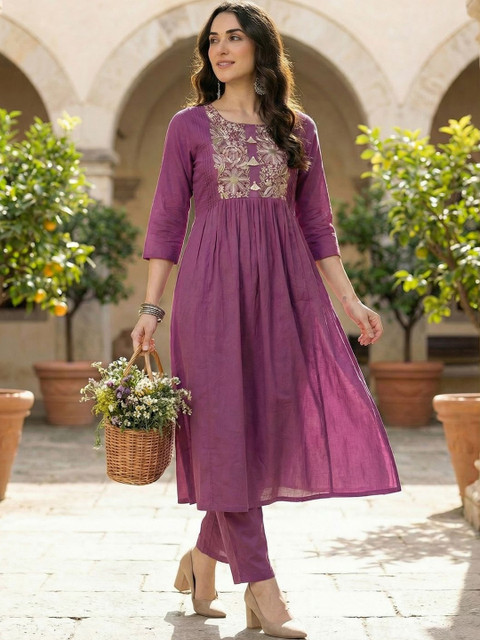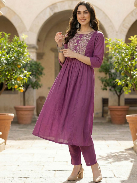 Purple embroidered tunic, has a round neck and Three-Quarter Sleeves, secured with slip-on closure