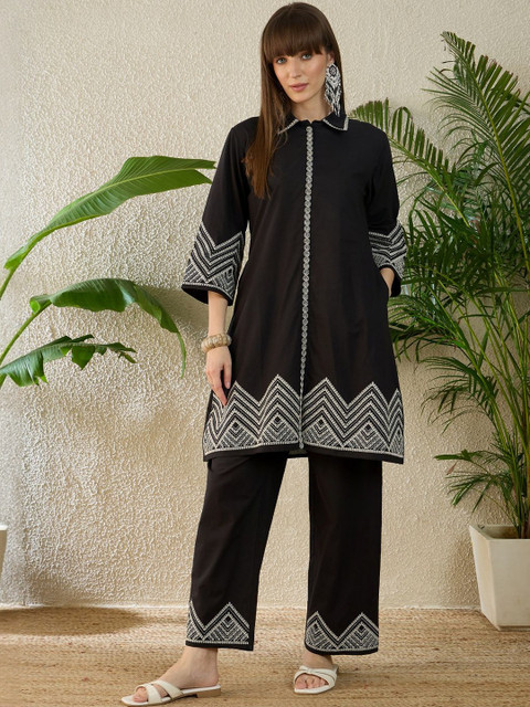 Indo Era Embroidered Shirt Collar Three-Quarter Sleeves Pure Cotton Tunic And Trousers