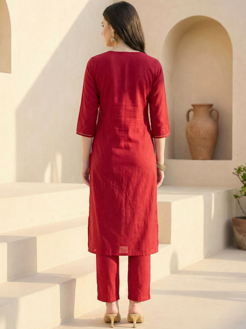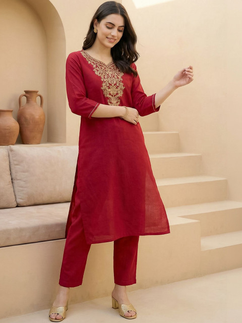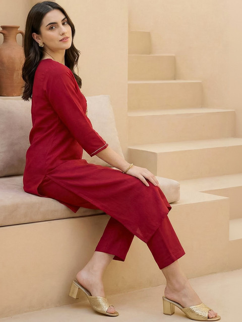 Red embroidered top , has a round neck and three-quarter sleeves, secured with slip-on closure