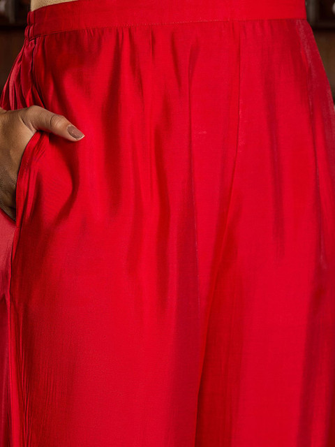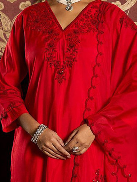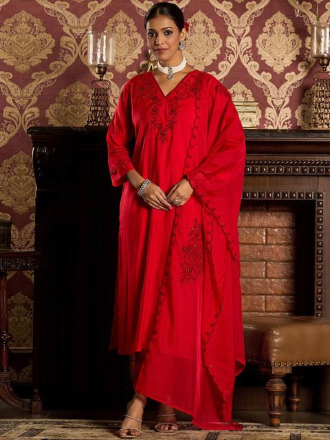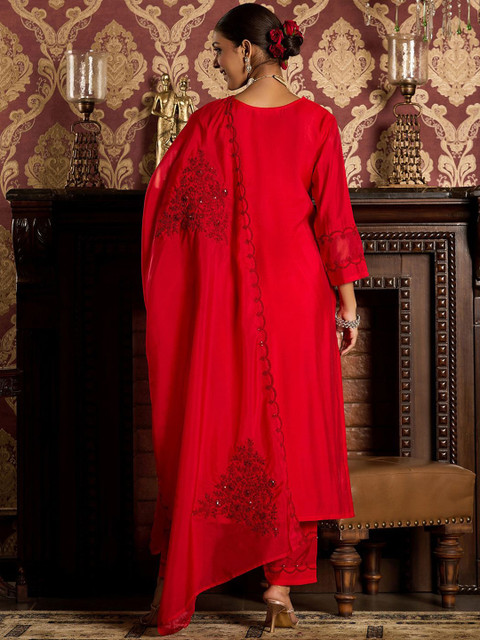 Red ethnic motifs embroidered sequined straight kurta with trousers & dupatta