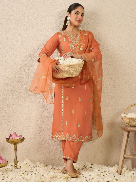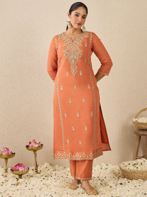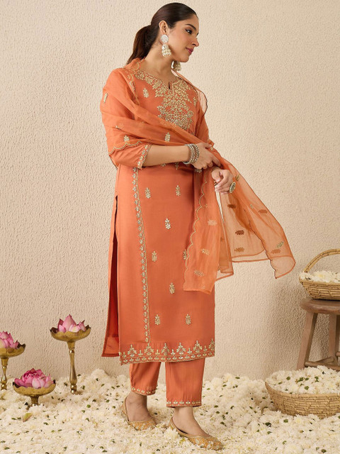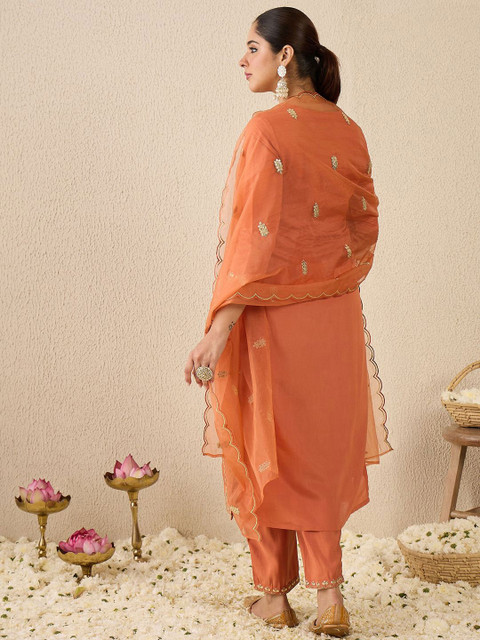 Peach & gold embroidered kurta with trousers & dupatta