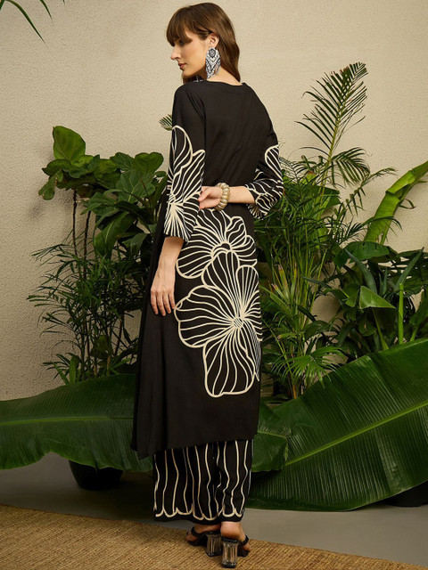Black printed palazzos, has an elasticated waistband with slip-on closure