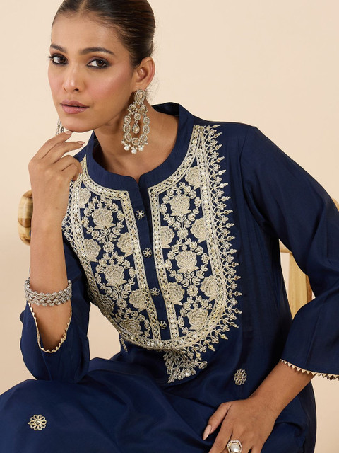 Indo Era Printed Mandarin Collar Three-Quarter Sleeves Top With Trousers