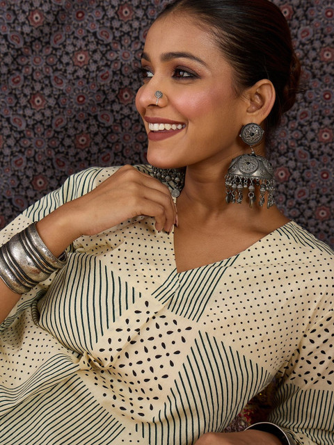 Beige printed tunic, has a v-neck and three-quarter sleeves, secured with slip-on closure