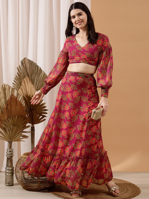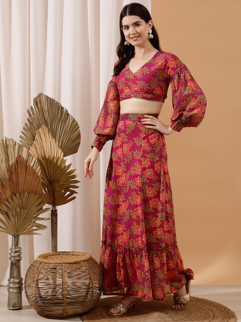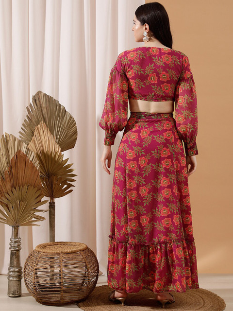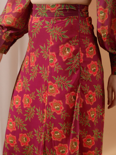 Fuchsia pink floral printed maxi skirt has waistband with side zip slip-on closure and flared hem