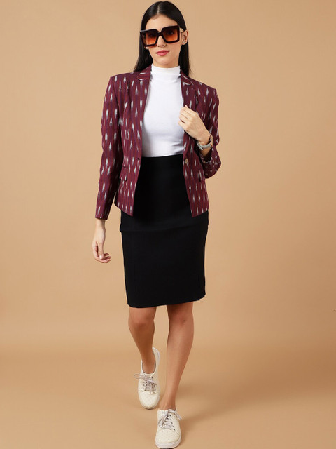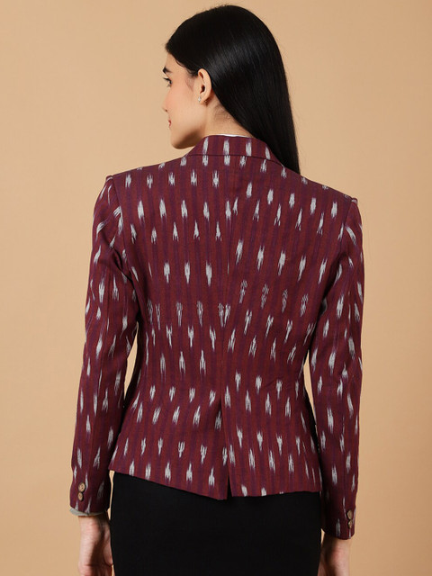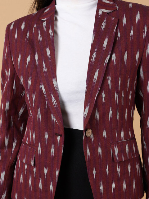 Maroon and white printed regular-fit casual blazer, has a notched lapel, long sleeves, single-breasted with double button closure, two flap pockets, one welt pocket and a double-vented back hem