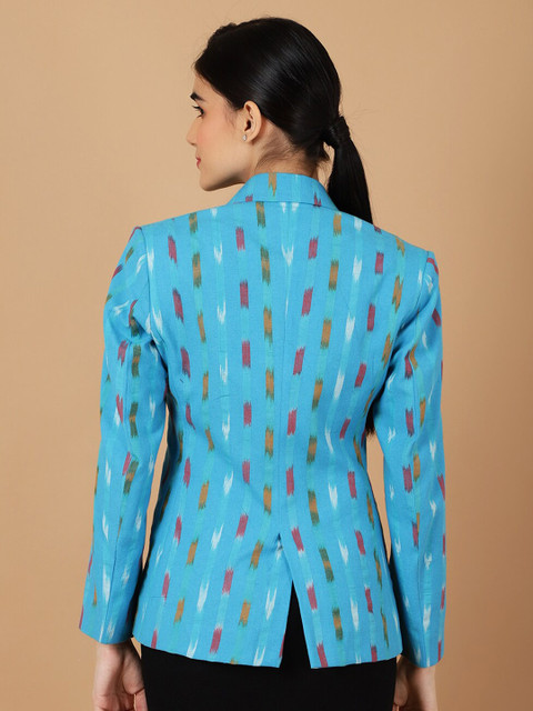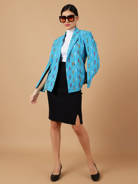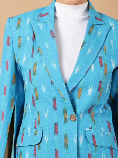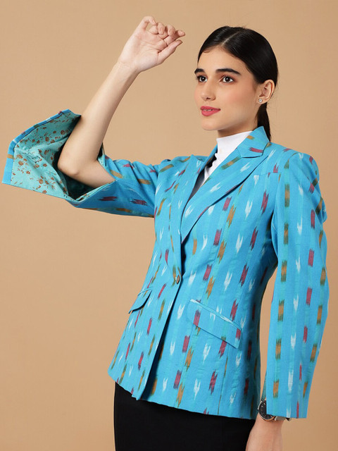 Blue, white & maroon printed regular-fit casual blazer, has a notched lapel, long sleeves, single-breasted with double button closure, two flap pockets, one welt pocket and a single-vented back hem