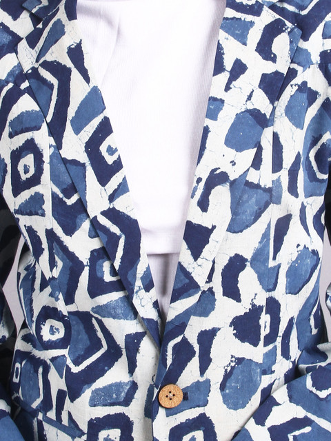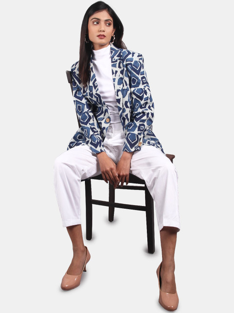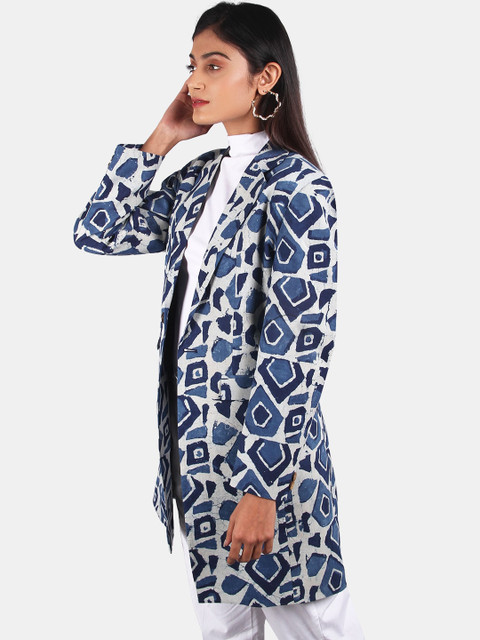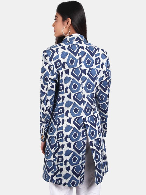 White and indigo-blue printed regular-fit long blazer, has a notched lapel, long sleeves, single-breasted with button closure and two pockets