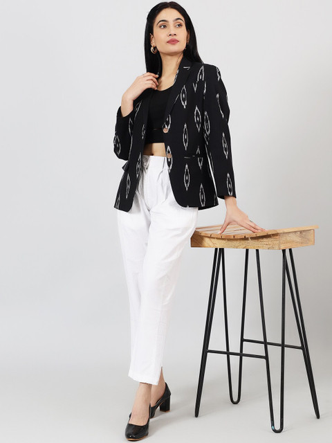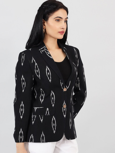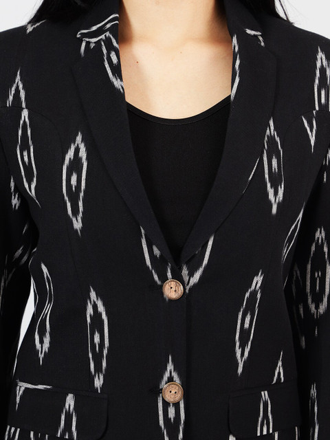 Black printed regular-fit casual blazer, has a notched lapel, long sleeves, single-breasted with double button closure, two flap pockets, one welt pocket and a single-vented back hem
