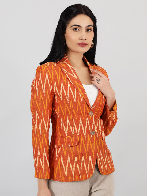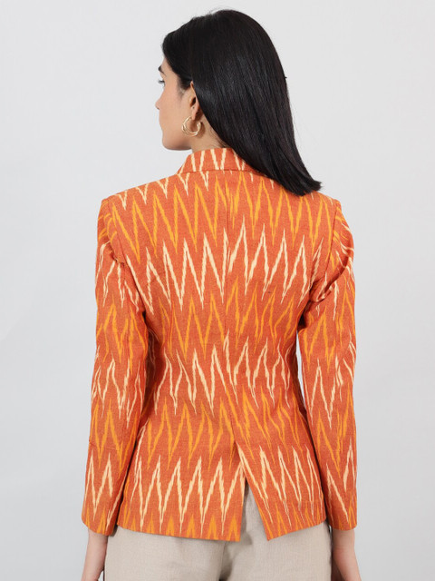 Orange colored printed regular-fit casual blazer, has a notched lapel, long sleeves, single-breasted with double button closure, two flap pockets, single-vented back hem