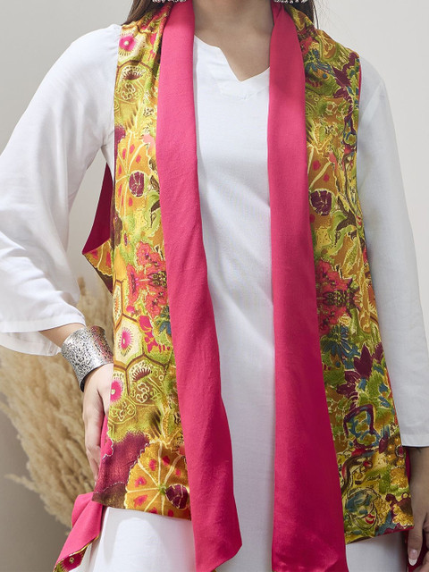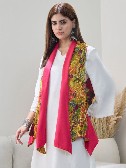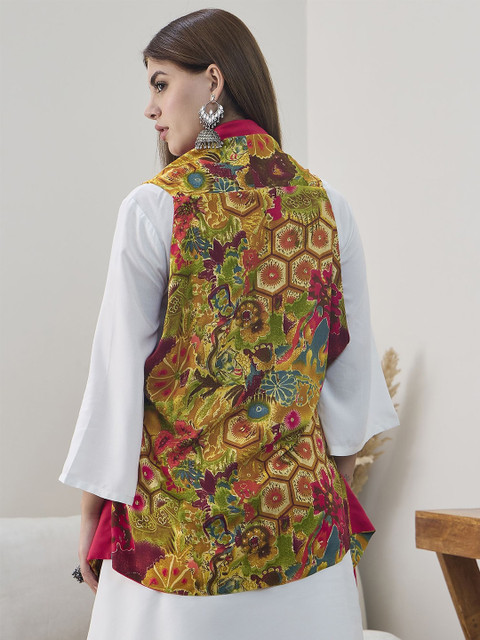 Mustard and red printed open front regular shrug ,has sleeveless, straight hem