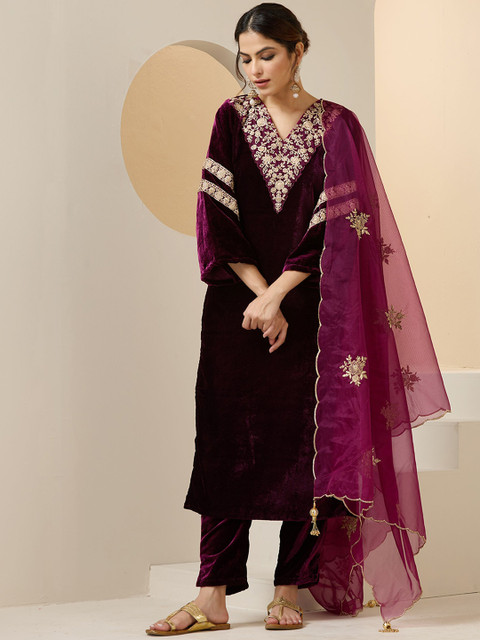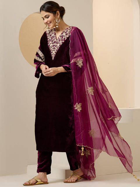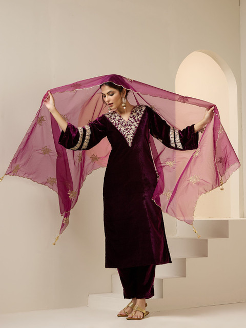 Ishin Women Ethnic Motifs Embroidered Regular Beads and Stones Velvet Kurta with Trousers & With Dupatta