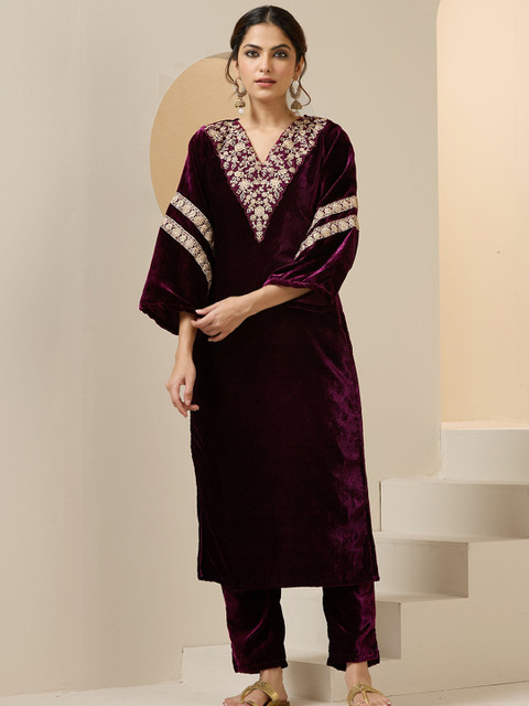 3 reviews for Ishin Women Ethnic Motifs Embroidered Regular Beads and Stones Velvet Kurta with Trousers & With Dupatta