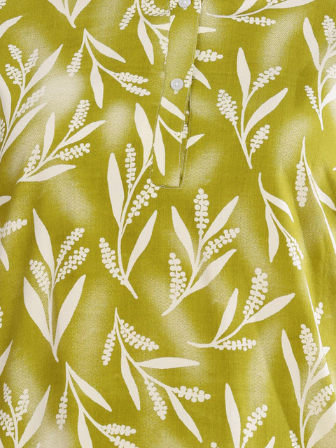 Green floral printed top has mandarin-neck and three-quarter sleeves with slip on closure