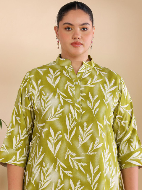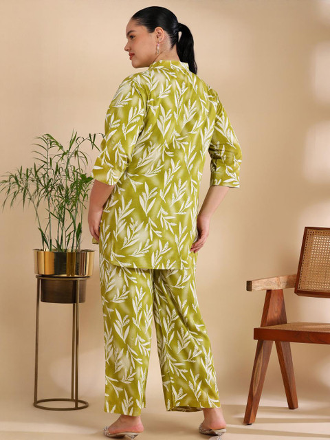 ISHQY Plus Size Floral Printed Pure Cotton Mandarin-Neck Top With Trousers Co-Ords
