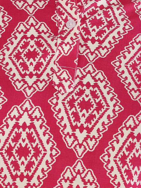 White floral printed top, has round neck and three fourth sleeves with slip on closure