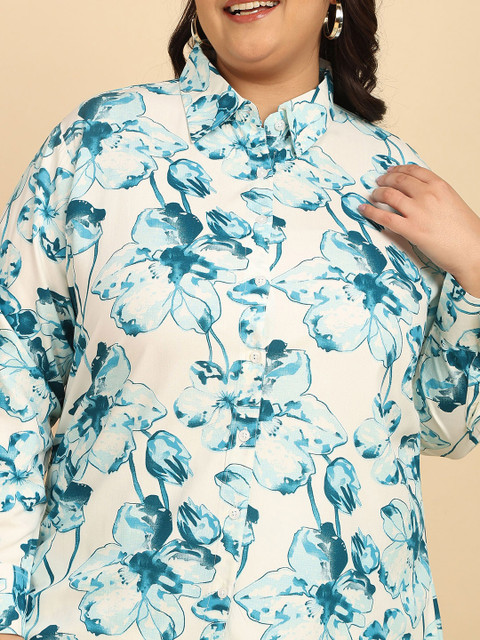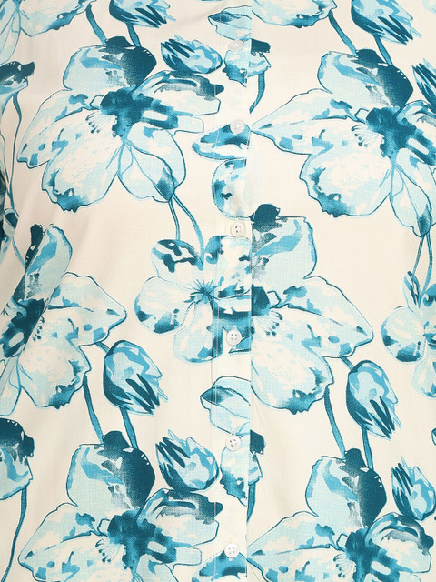 White printed shirt, has a polo neck and long sleeves, secured with button closure