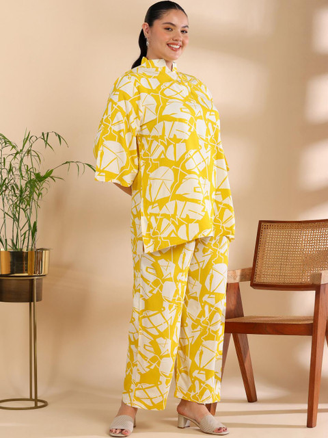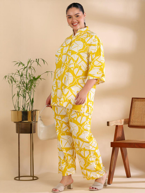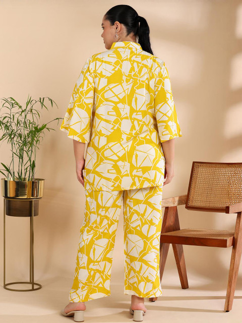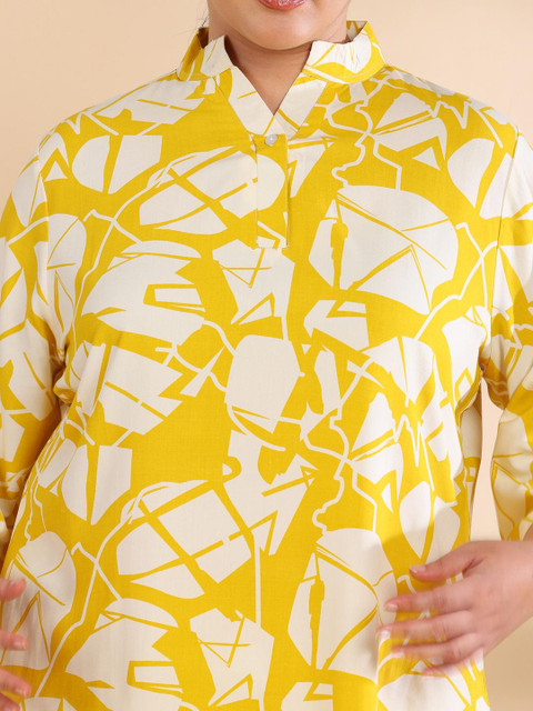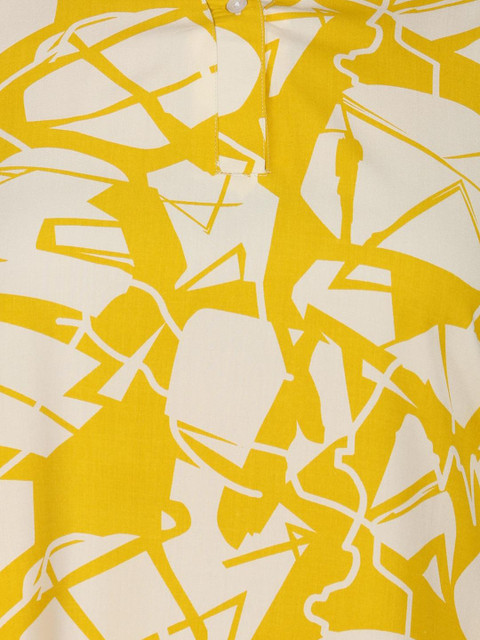Yellow printed top, has a shirt collar neck and three quarter sleeves, secured with button closure