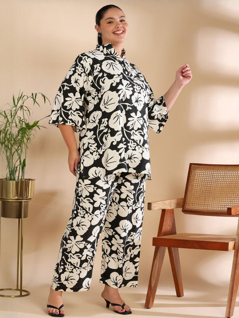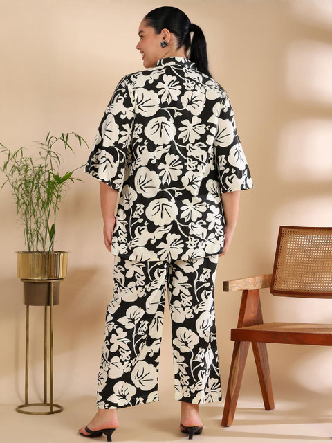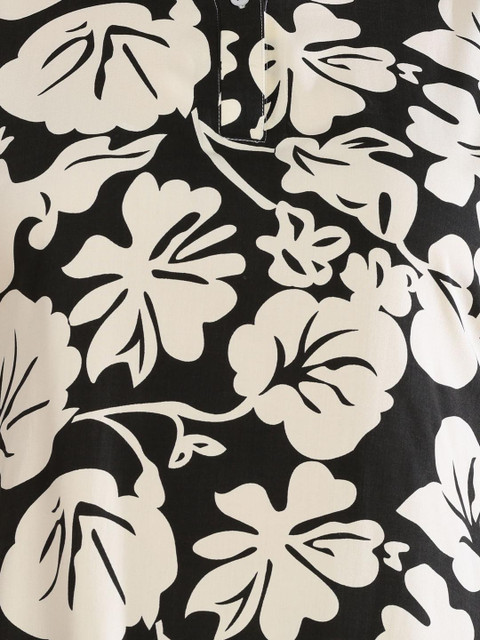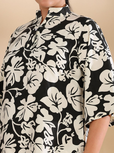 Black and white printed top, has a mandarin collar neck and three quarter sleeves, secured with button closure