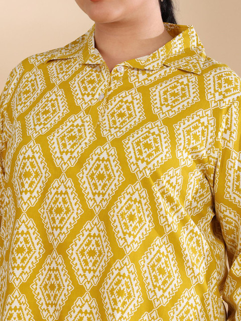 Yellow printed top, has a shirt collar neck and three quarter sleeves, secured with button closure