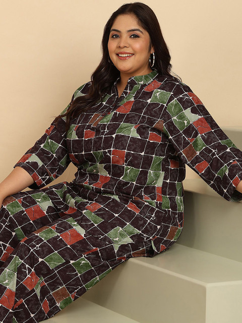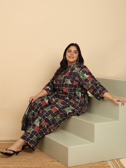 Black printed top, has a polo neck and three-quarter sleeves, secured with button closure