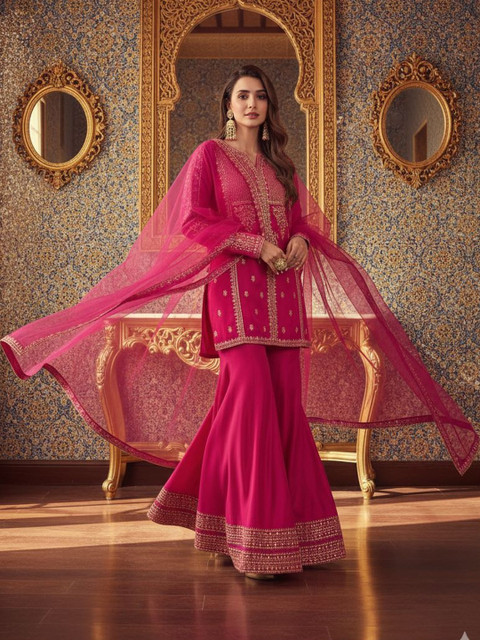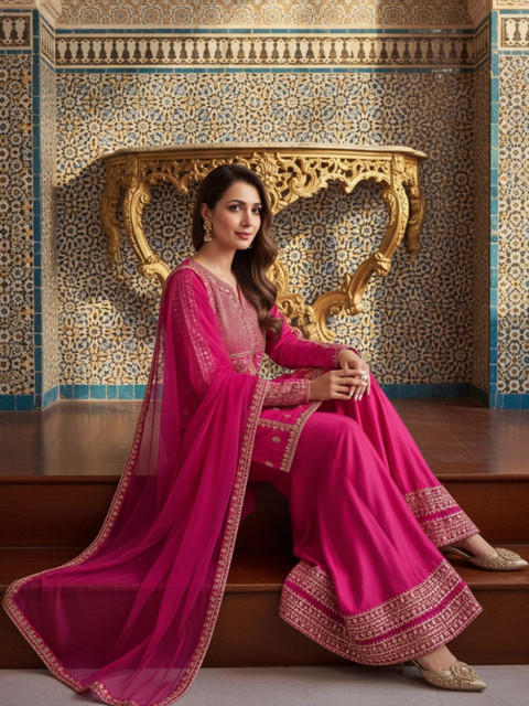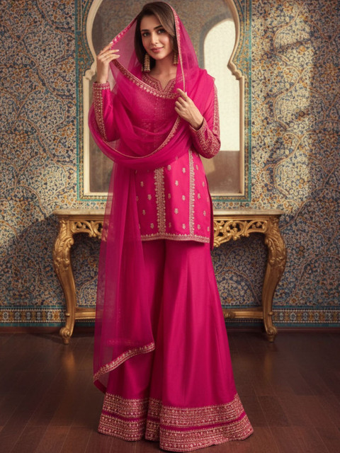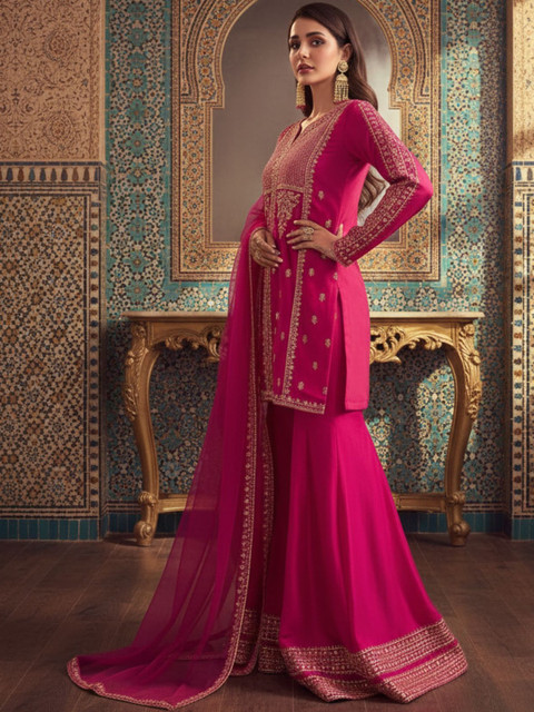 Pink Embroidered Kurta with Palazzos With Dupatta