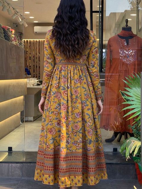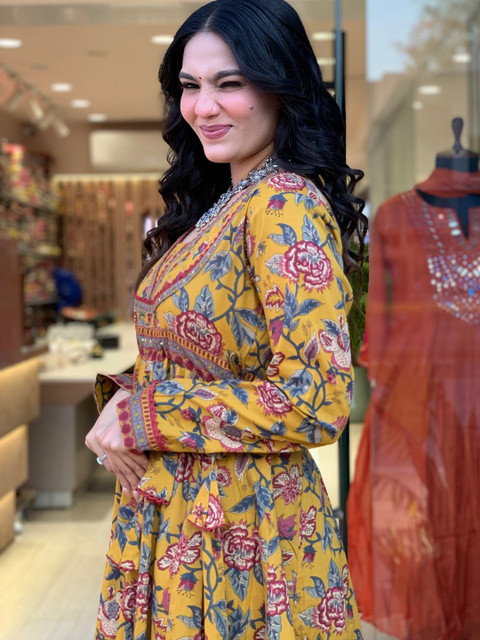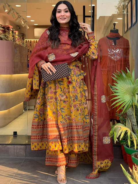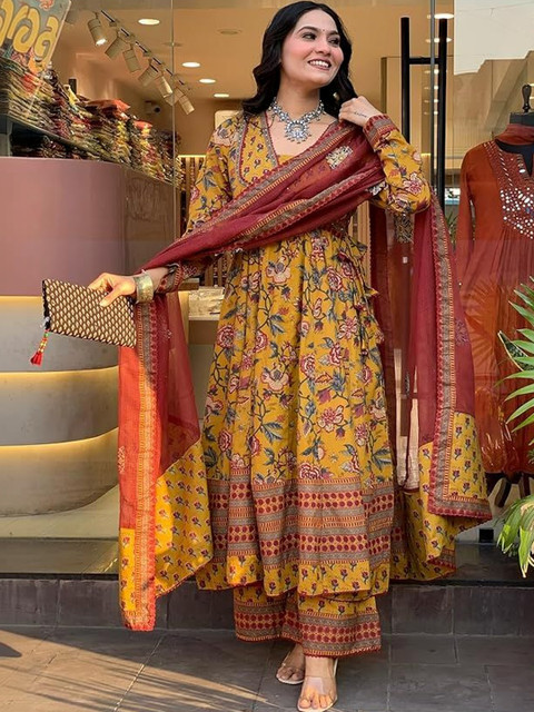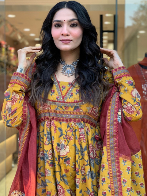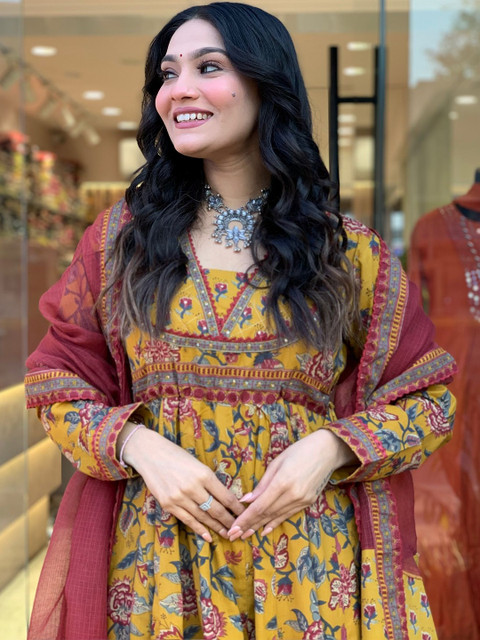 Style this elegant printed cotton kurta set with oxidised silver jewellery or a statement choker, block heels or ethnic juttis, and soft curls or a half-tied hairstyle. Add a subtle bindi and warm-toned makeup to complement the rich prints and contrast dupatta. All the accessories shown are for styling purposes only. Slight color variation may occur due to photographic reasons.